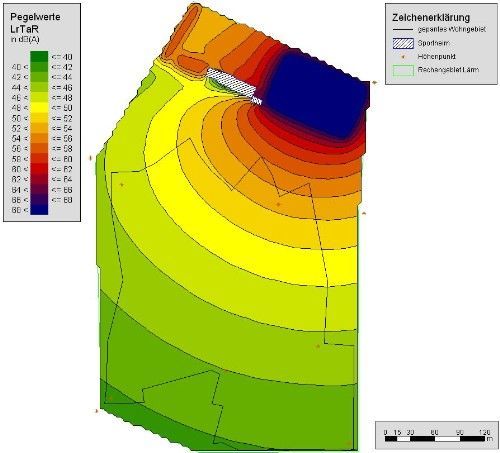 Ermittlung und Darstellung der Auswirkungen von Sportlärm auf ein geplantes Wohngebiet in Form von Isophonen (= Linien gleichen Schalldrucks).